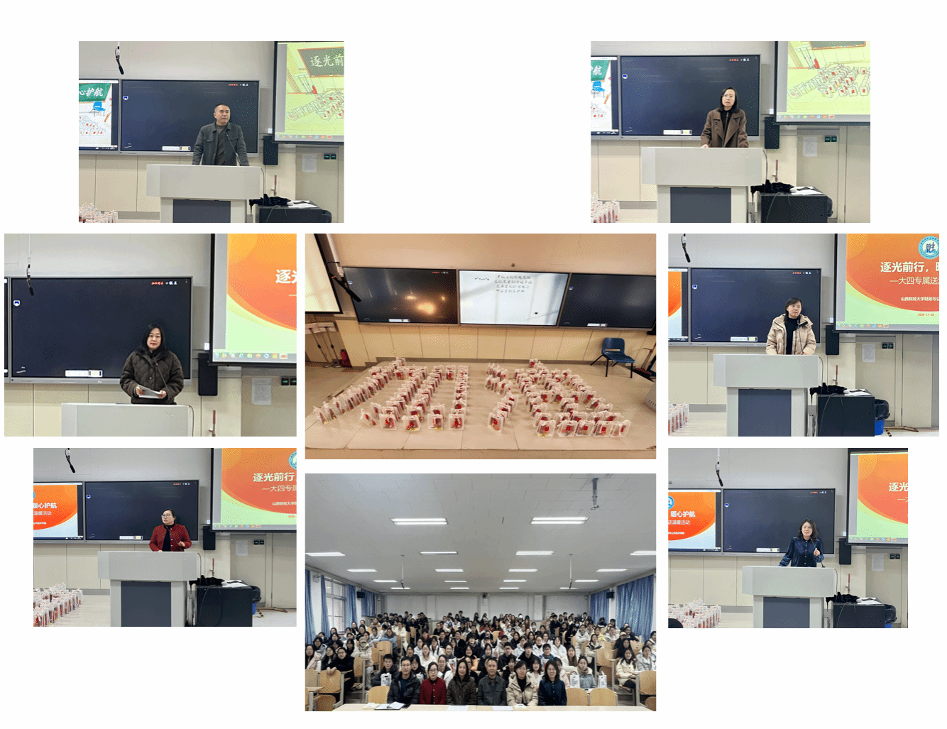 在坞城校区立信楼阶梯教室206举行“逐光前行,暖心护航”大四专属送温暖活动,为全体2022级本科生送上学习用具和美好祝福。学院领导、毕业班辅导员、教师代表及全体2022级本科生共210余人参加了此次活动。