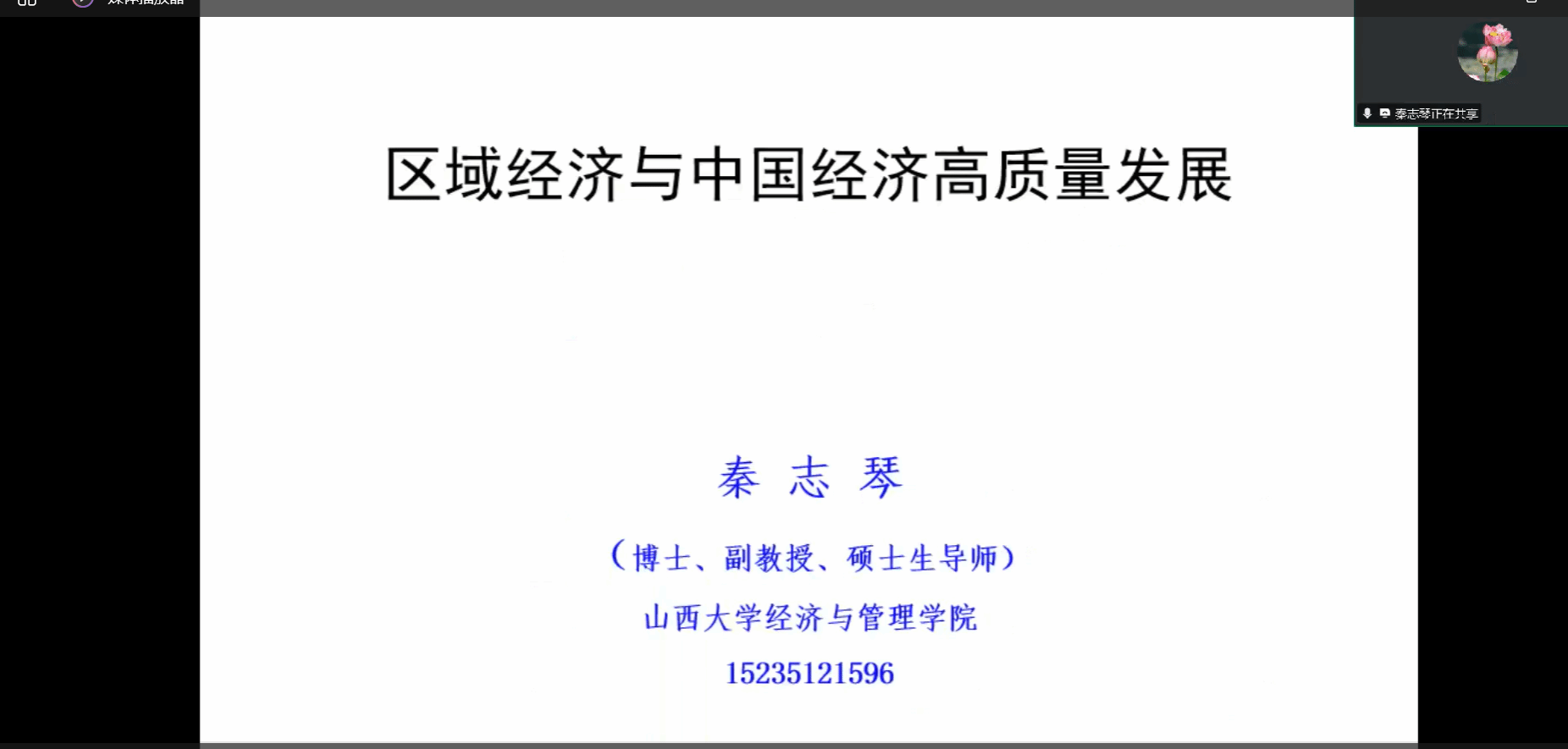 在6月30日下午的区域经济与中国经济高质量发展的讲座中,山西大学的秦志琴副教授从区域经济高质量发展和区域发展重大战略两个方面进行讲解。首先从狭义和广义两个维度界定了区域经济增长的含义。继而援引《人民日报》刊载的《牢牢把握高质量发展这个根本要求》一文指出高质量发展是能够很好满足人民日益增长的美好生活需要的发展,是体现“创新、协调、绿色、开放、共享”的新发展理念的发展。秦老师进一步为我们揭示了新中国成立以来宏观战略的演变历程,当前的战略焦点,以及如何准确把握新发展阶段的关键要素。接着又讲述了国家层面相关重要发展战略,以及得出区域差异大,发展不平衡是中国的基本国情。此外,通过直观的数据和图表,详细展示了我国近年来城镇与乡村协调发展的动态变化,以及我国边境省份与邻国人均GDP的对比情况,最后展示了新时代我国区域重大战略实施的主要成就(京津冀、长江经济带、黄河流域等)和山西省的重大发展战略(由“煤老大”向“能源革命排头兵”的蜕变)。